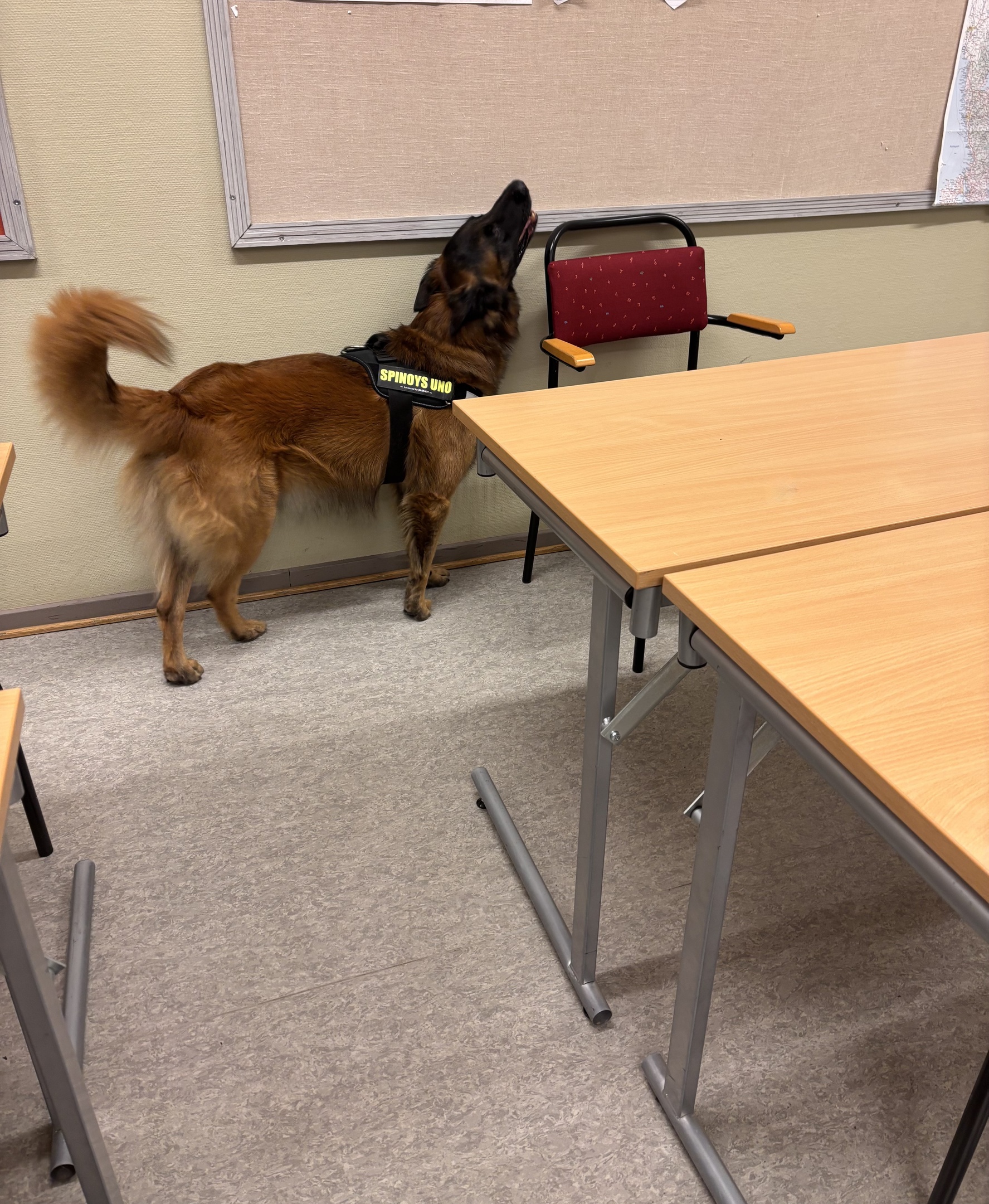Vår hund är utbildad och certifierad för sök efter narkotika/droger/vapen.